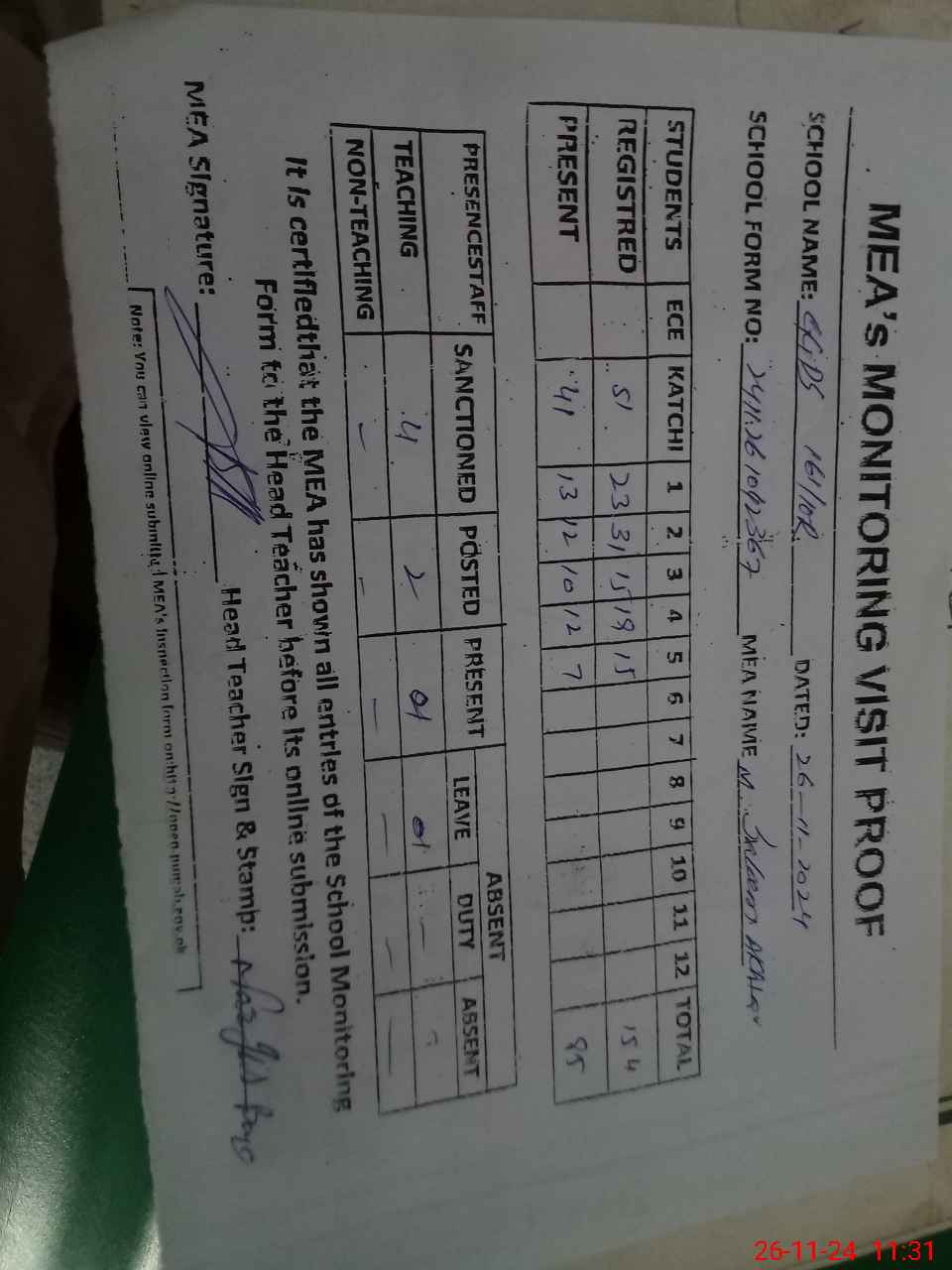 | Attendance Register | Head Teacher | MEA with School | Visit Proof |