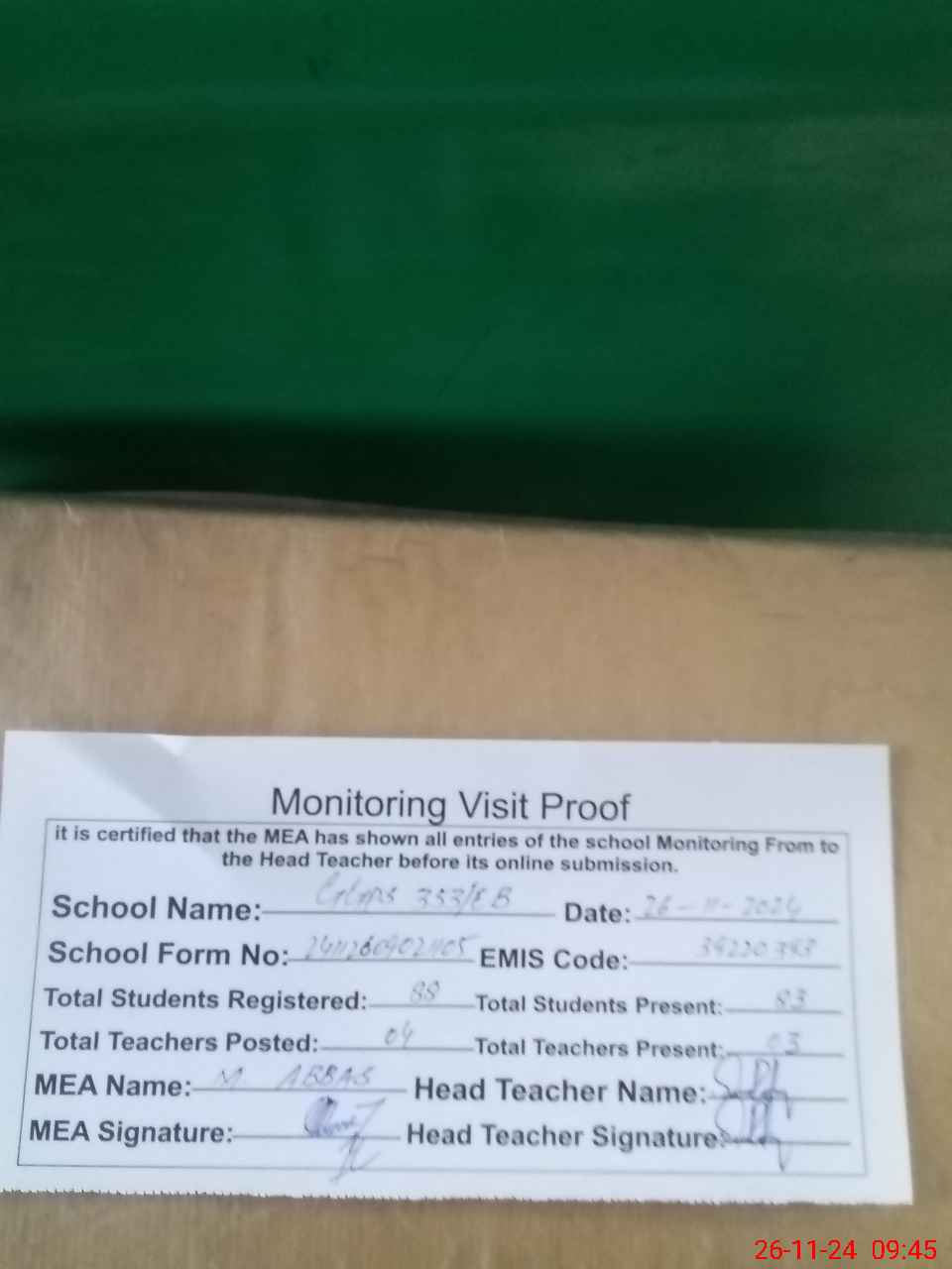| Attendance Register | Head Teacher | MEA with School | Visit Proof |