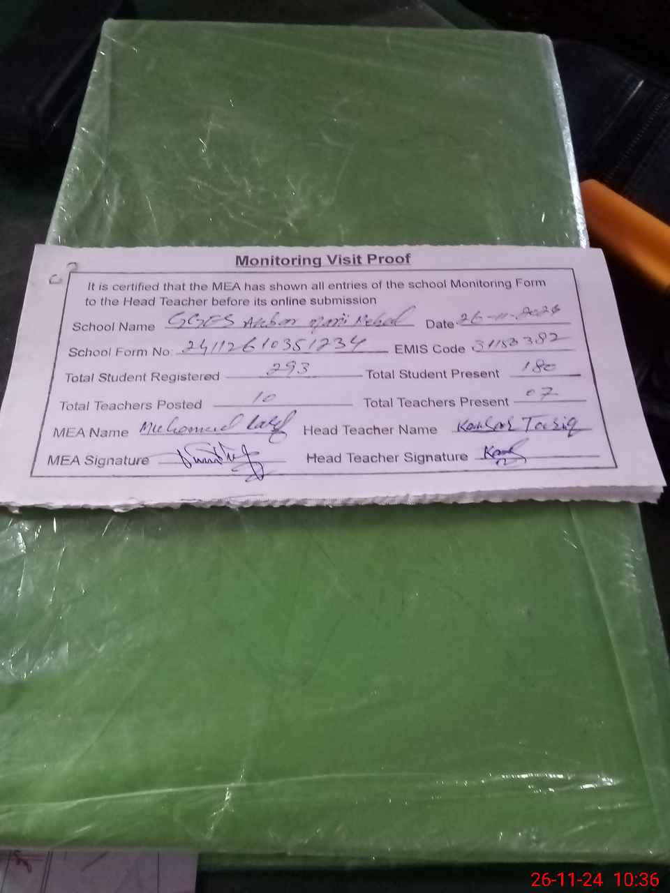 | Attendance Register | Head Teacher | MEA with School | Visit Proof |
