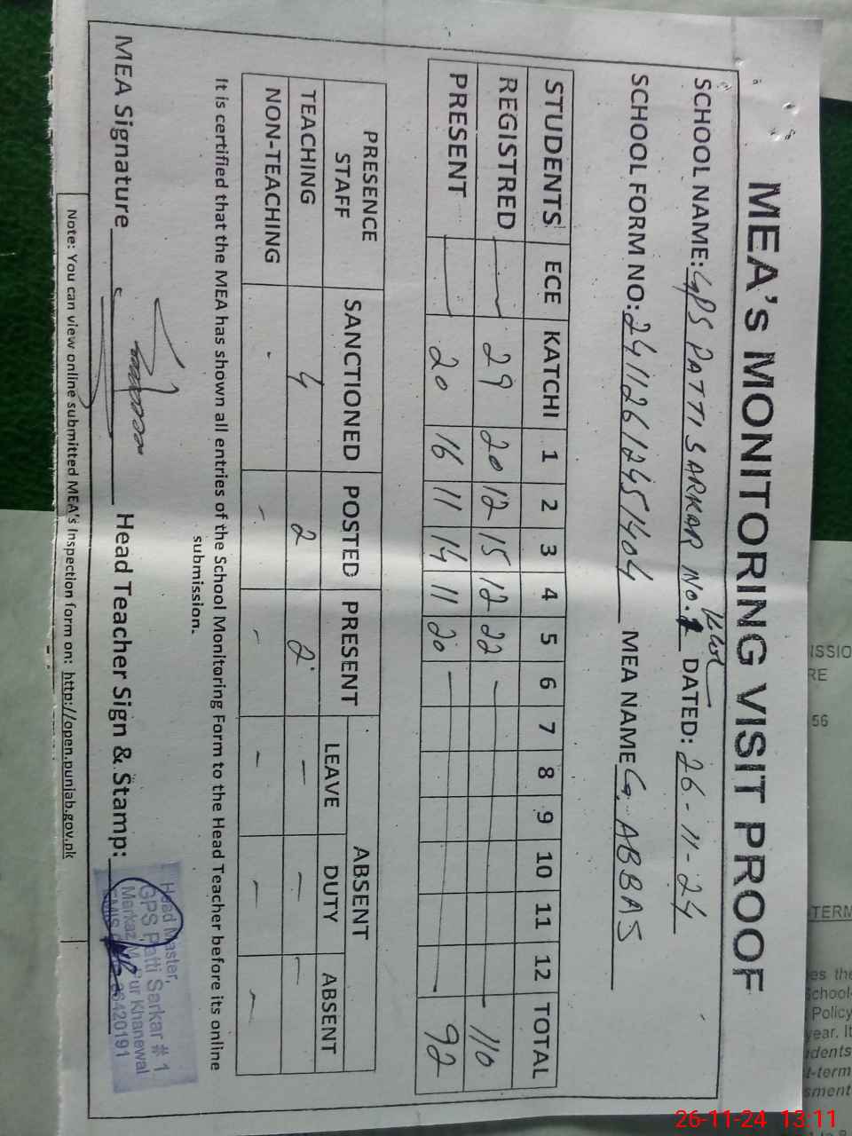 | Attendance Register | Head Teacher | MEA with School | Visit Proof |