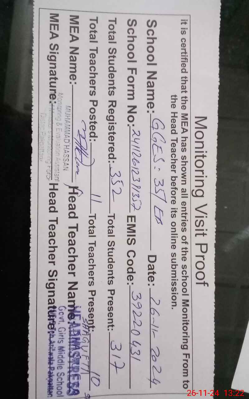 | Attendance Register | Head Teacher | MEA with School | Visit Proof |