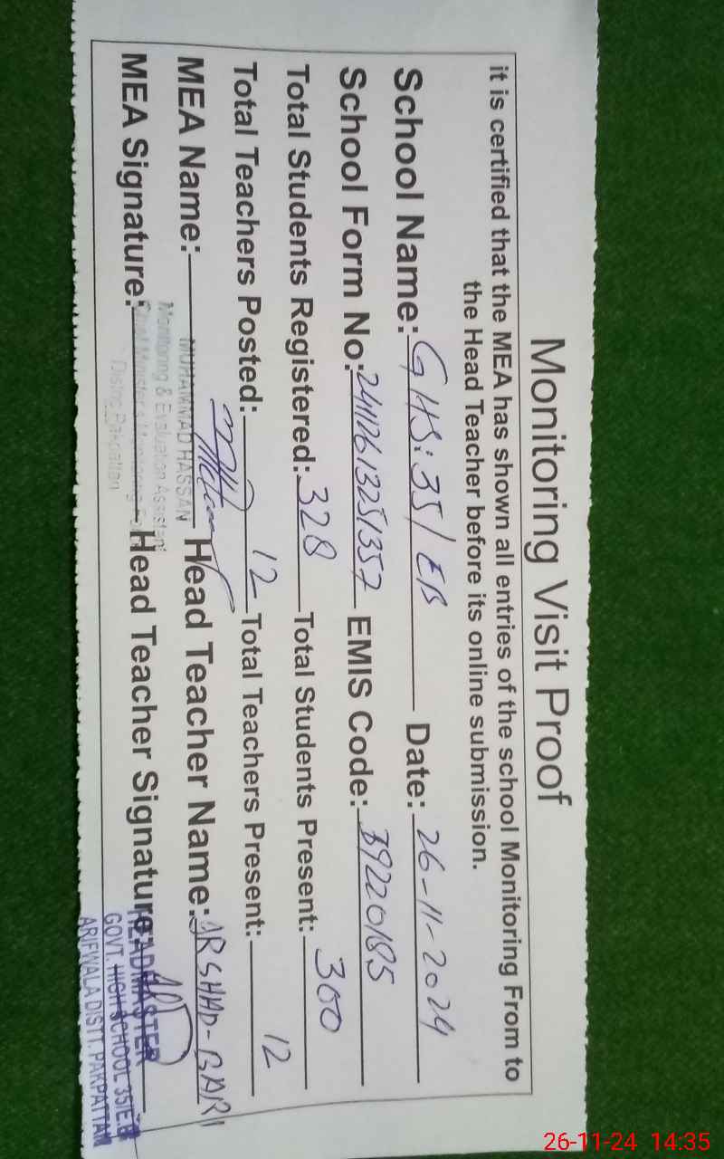 | EMIS Code: 39220185 | Name of School: GHS 35 EB ARIFWALA | |||