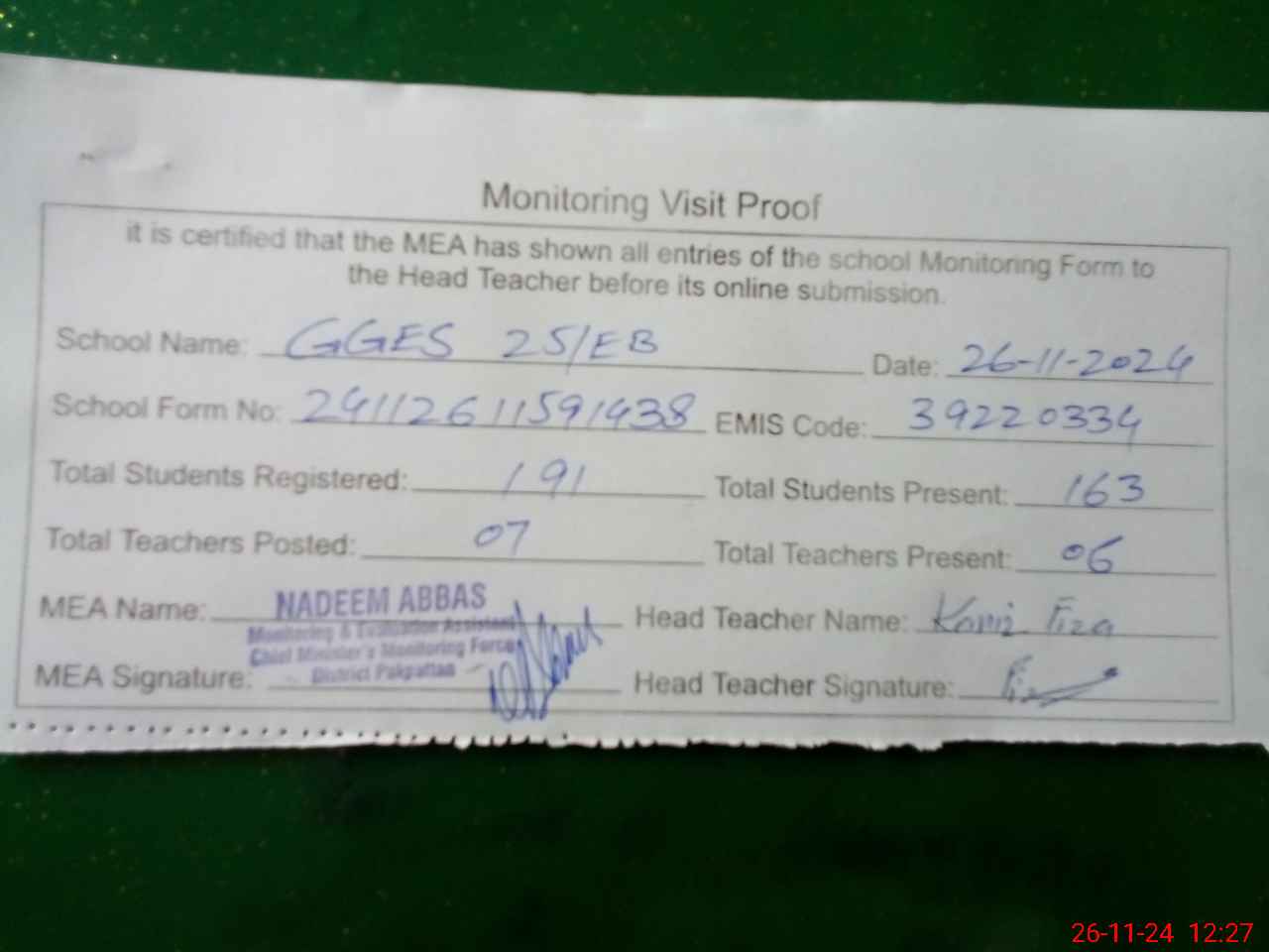 | EMIS Code: 39220334 | Name of School: GGES CHAK NO 25 EB | |||