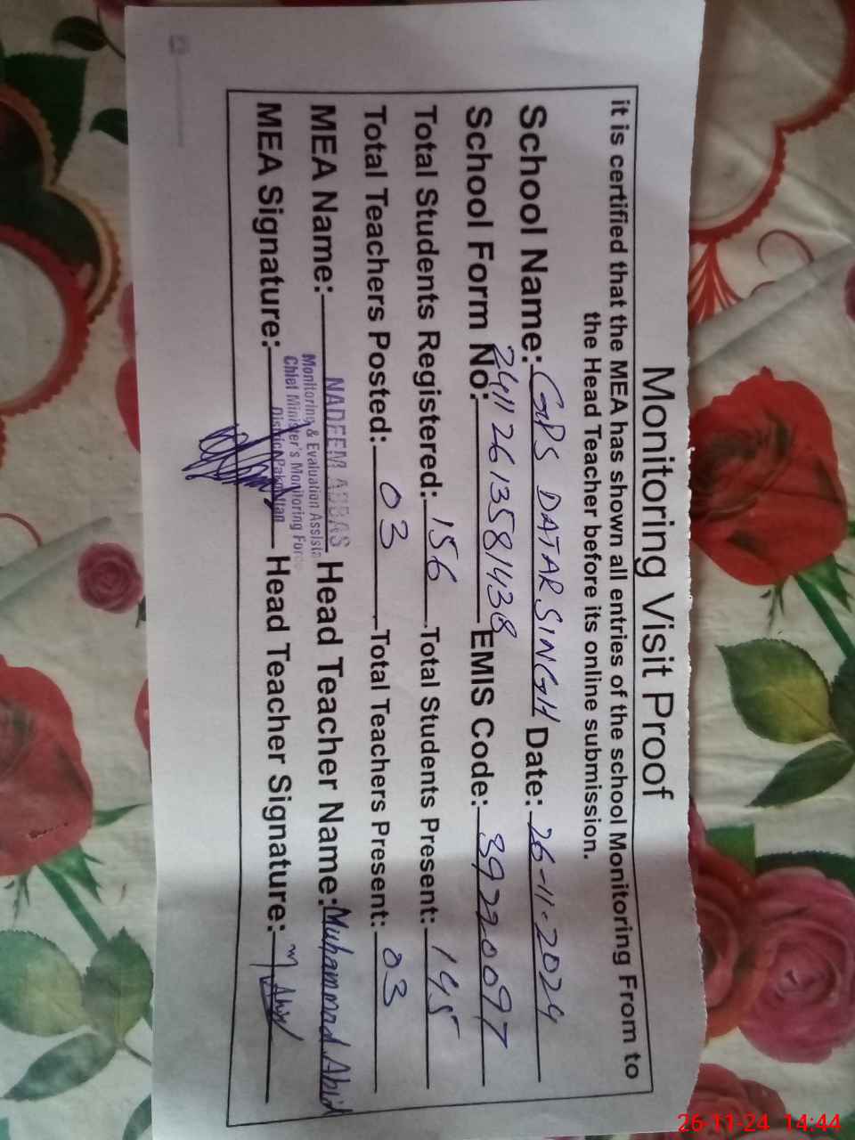 | Certified that this School was Inspected by the Undersigned MEA/DMO Today and the Information Stated Above is as Per Record. | |||||