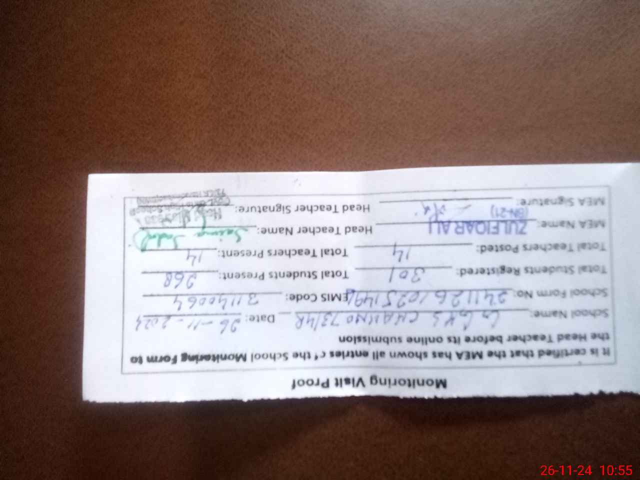 | Monitoring Date: 26-11-2024 | Start Time: 26-11-2024 10:25 AM | End Time: 26-11-2024 10:55 AM | Name of MEA: Zu**** Al**** BN**** | |