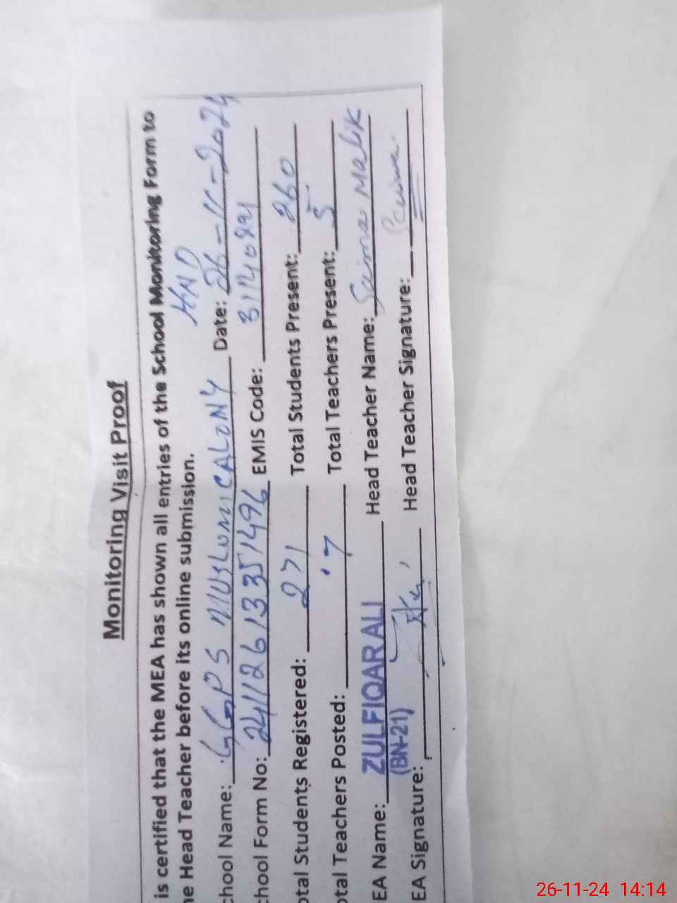 | Attendance Register | Head Teacher | MEA with School | Visit Proof |