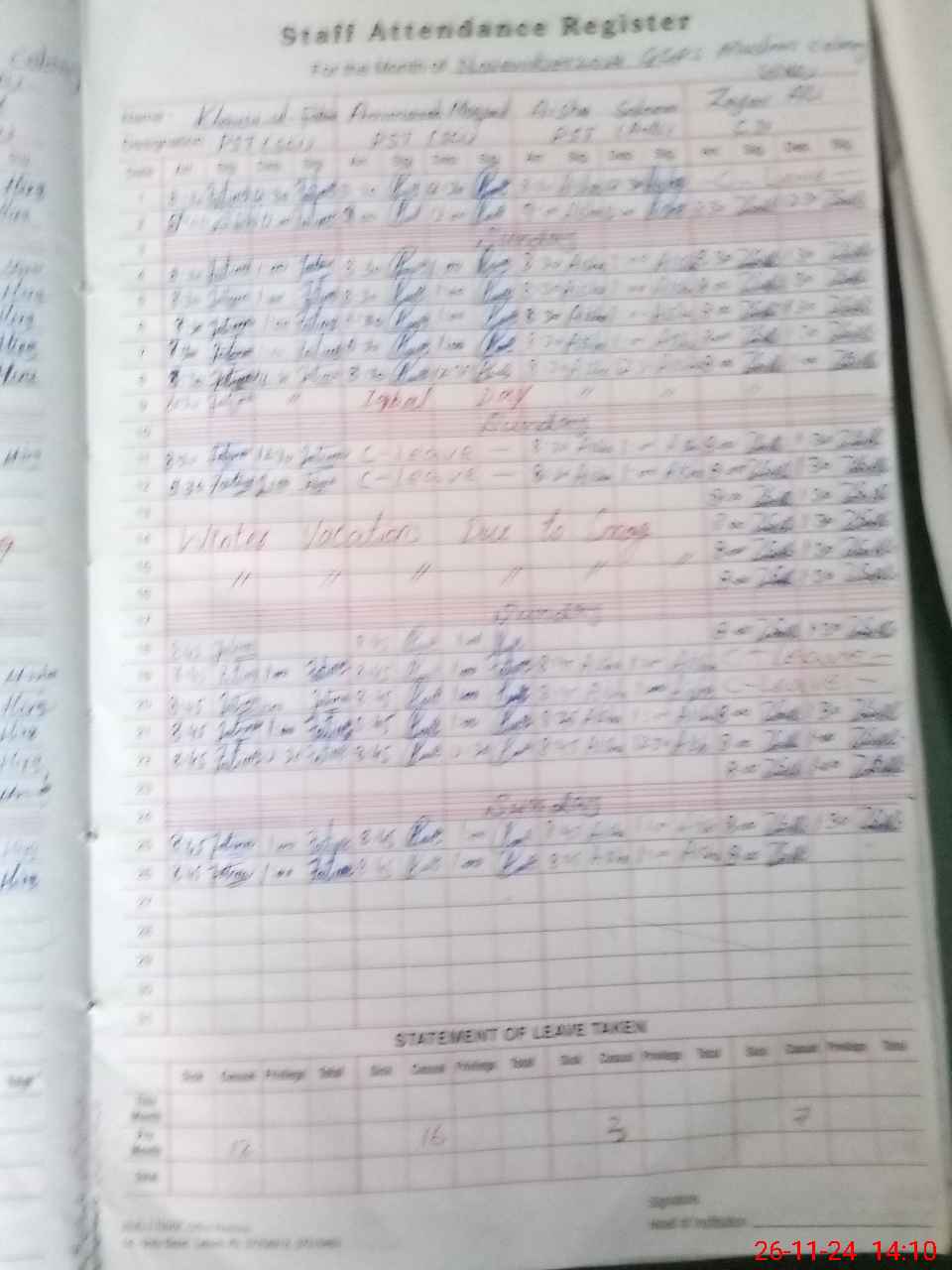 | Leave | Duty | Absent | Maternity | Medical | Ex- Pak |