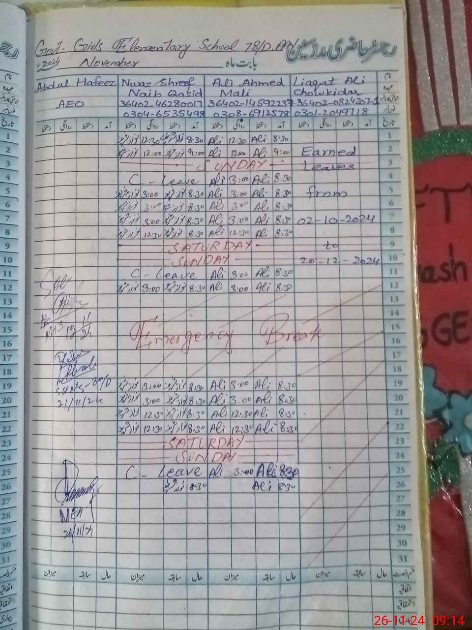 | Monitoring Date: 26-11-2024 | Start Time: 26-11-2024 09:01 AM | End Time: 26-11-2024 09:59 AM | Name of MEA: AM**** UL**** | |