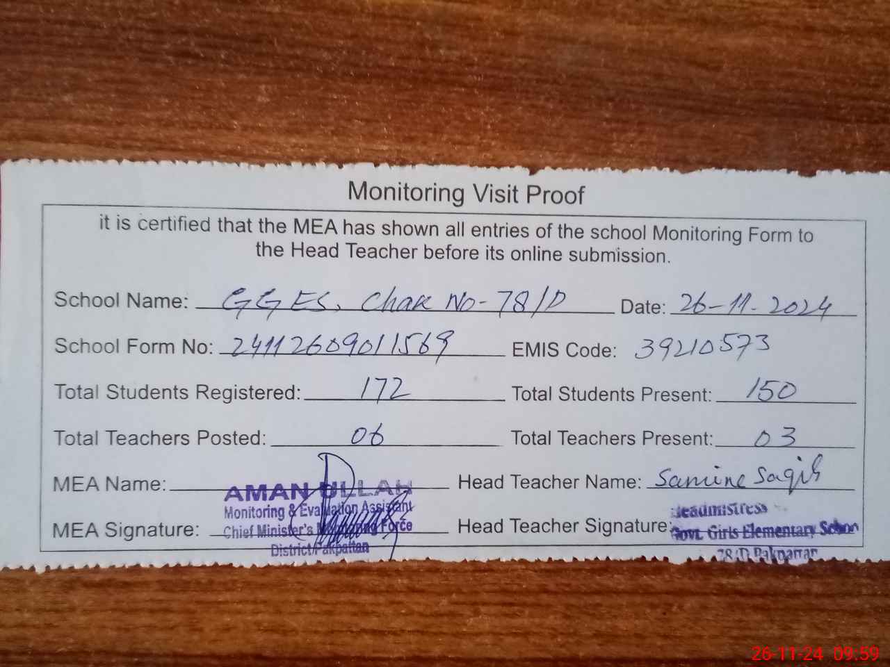| Attendance Register | Head Teacher | MEA with School | Visit Proof |