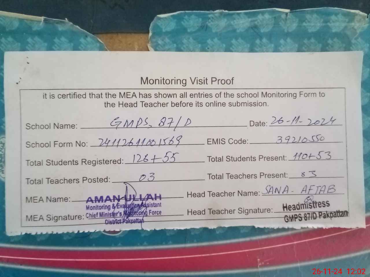 | Attendance Register | Head Teacher | MEA with School | Visit Proof |