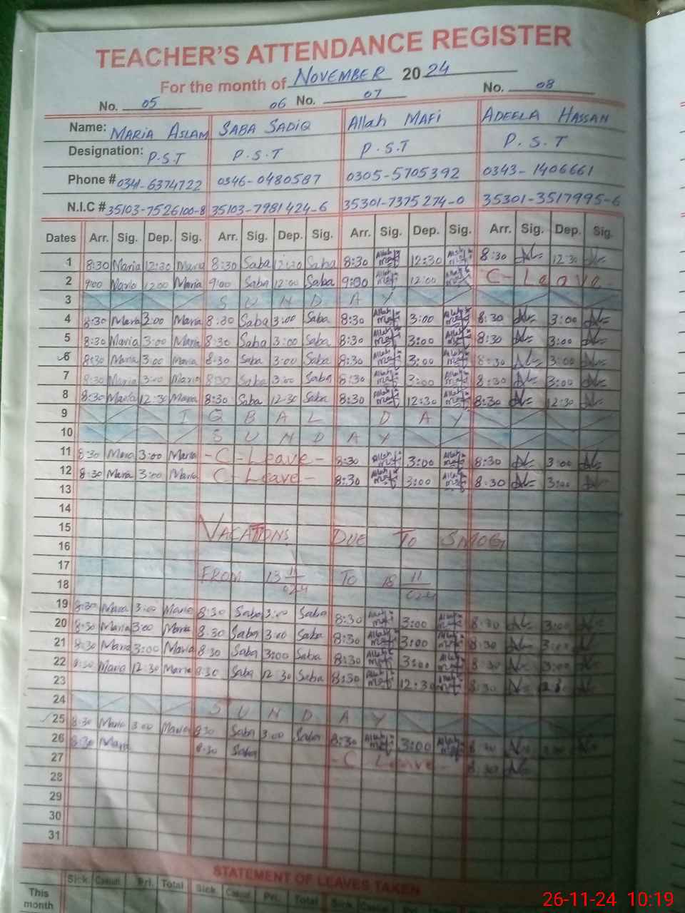 | CNIC | Full Name | Designation | R/C | Absence During Last Calender Month |