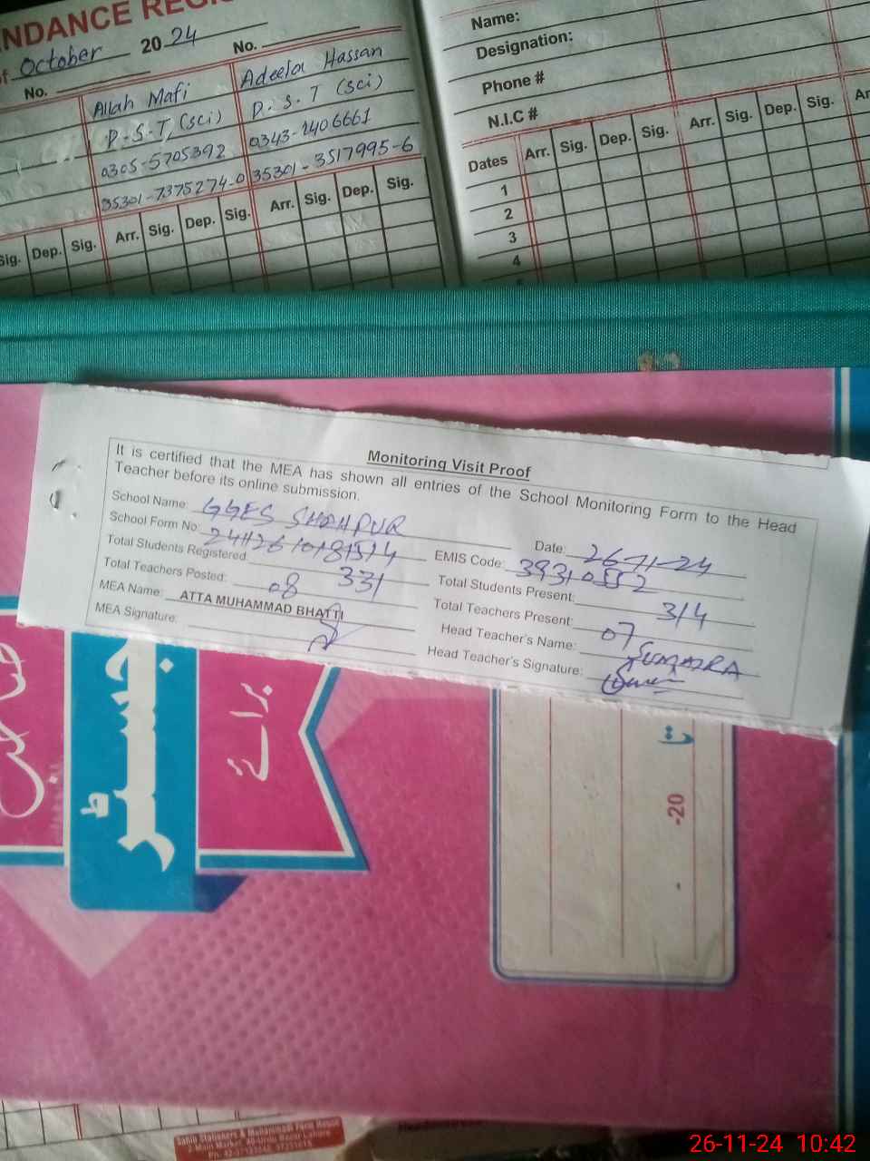 | Attendance Register | Head Teacher | MEA with School | Visit Proof |