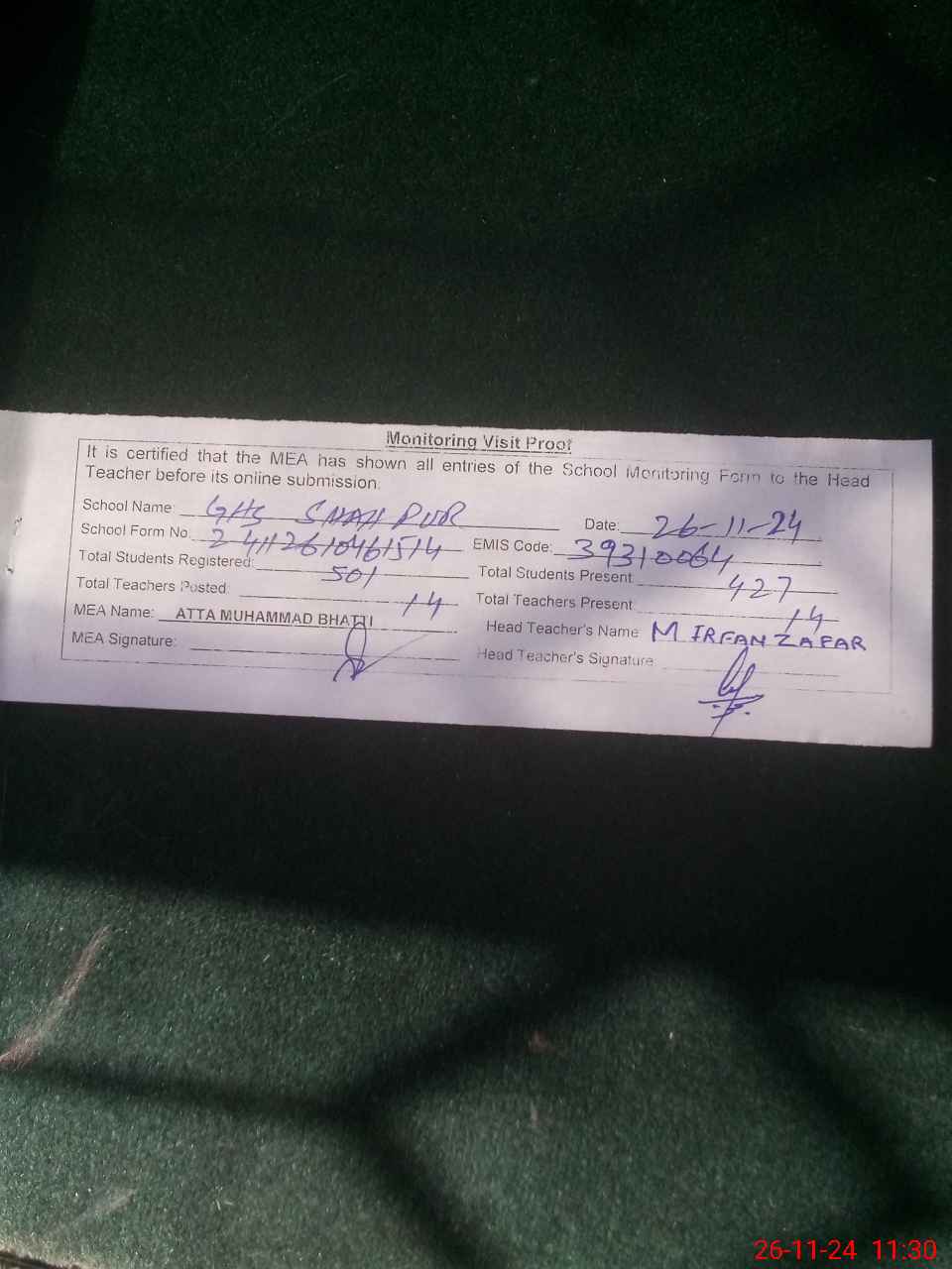 | Attendance Register | Head Teacher | MEA with School | Visit Proof |