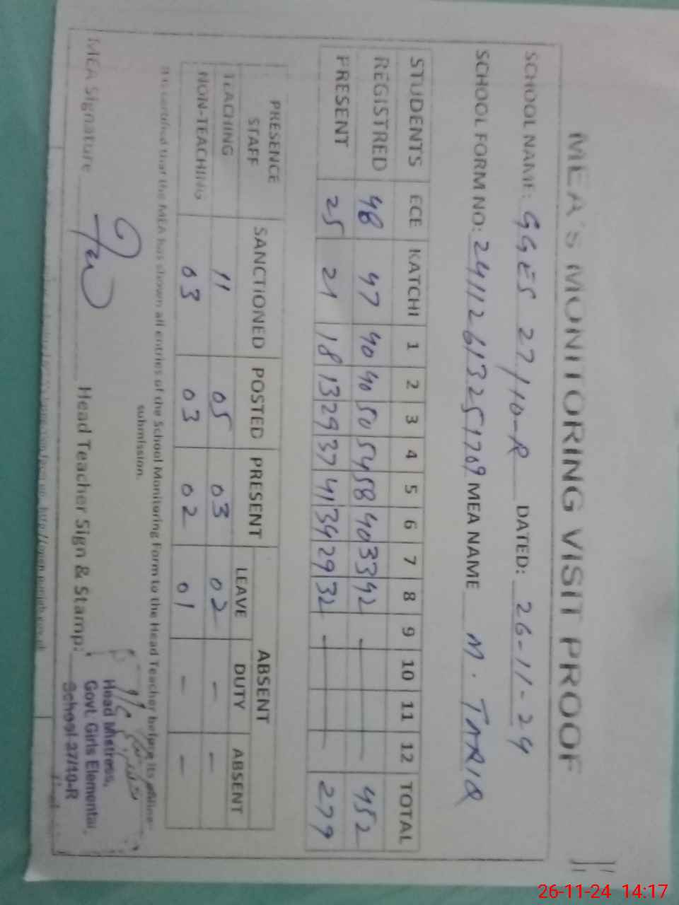 | Attendance Register | Head Teacher | MEA with School | Visit Proof |