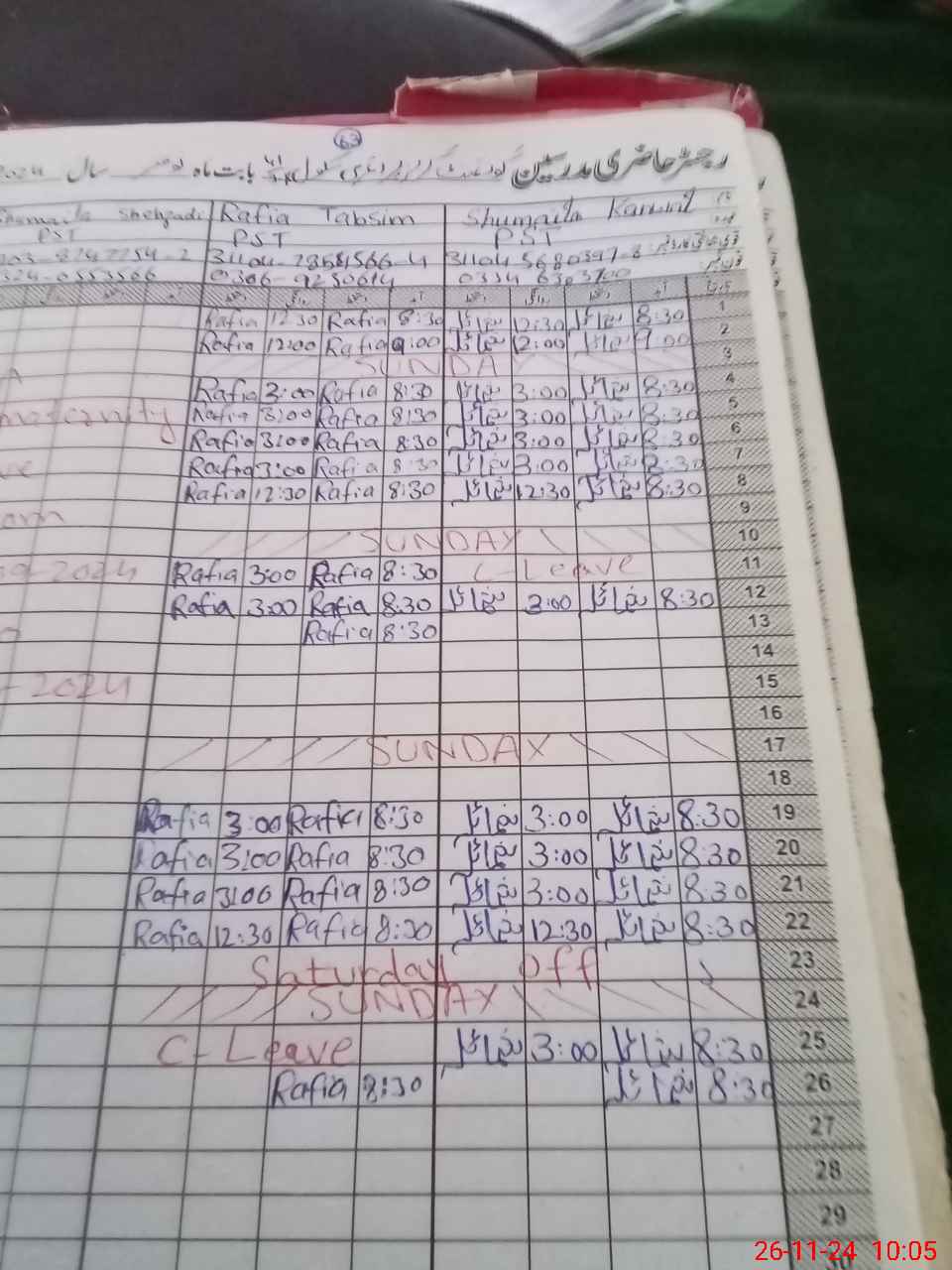 | Leave | Duty | Absent | Maternity | Medical | Ex- Pak |