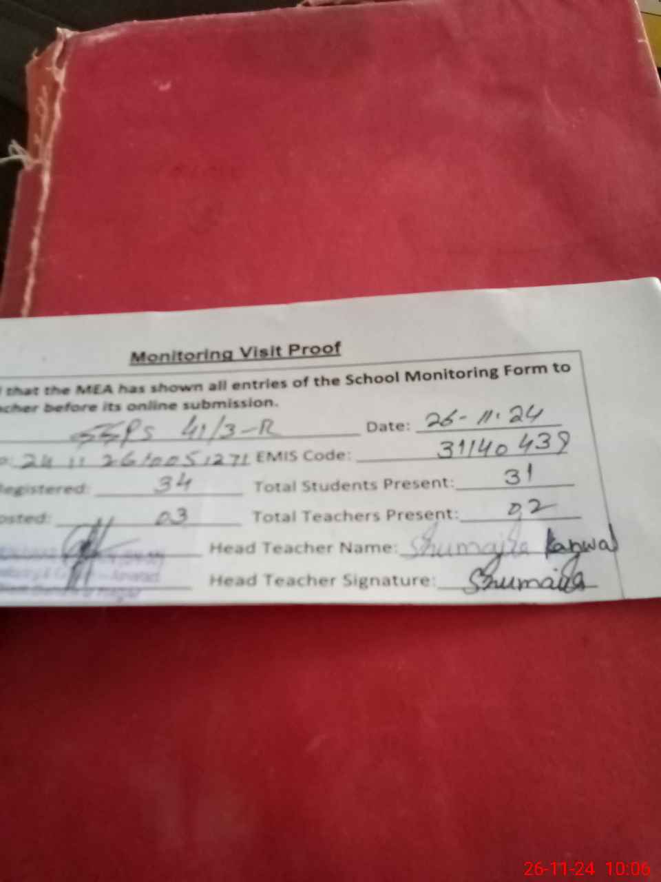 | Attendance Register | Head Teacher | MEA with School | Visit Proof |