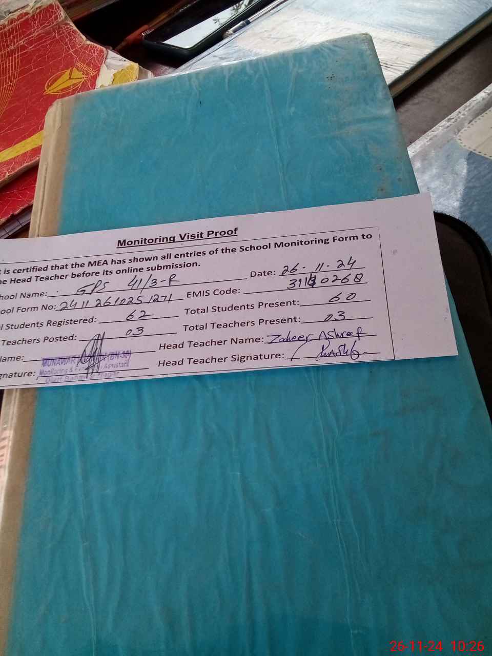 | Attendance Register | Head Teacher | MEA with School | Visit Proof |