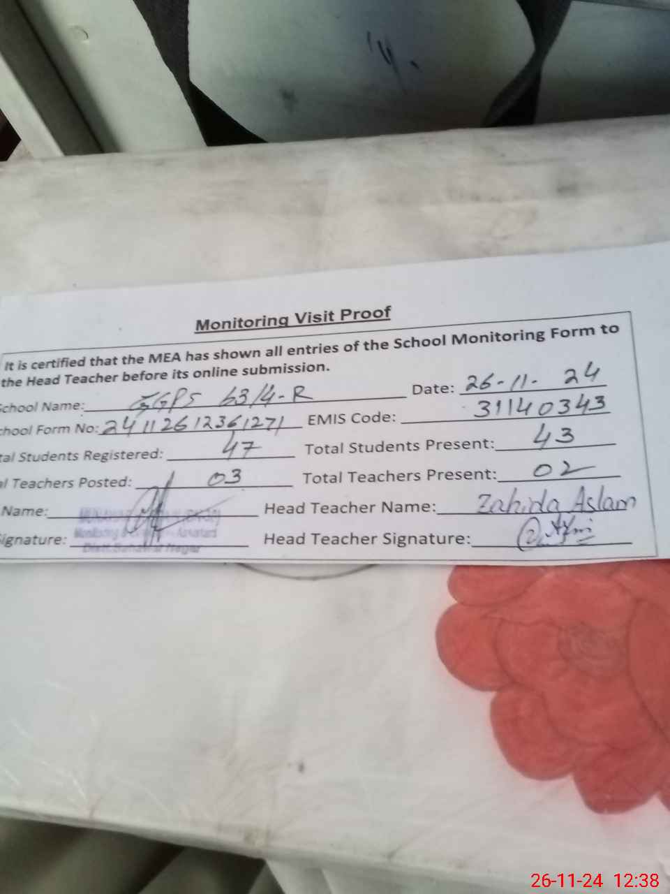 | Attendance Register | Head Teacher | MEA with School | Visit Proof |