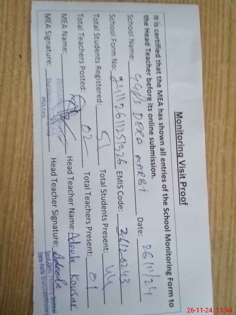 | Certified that this School was Inspected by the Undersigned MEA/DMO Today and the Information Stated Above is as Per Record. | |||||