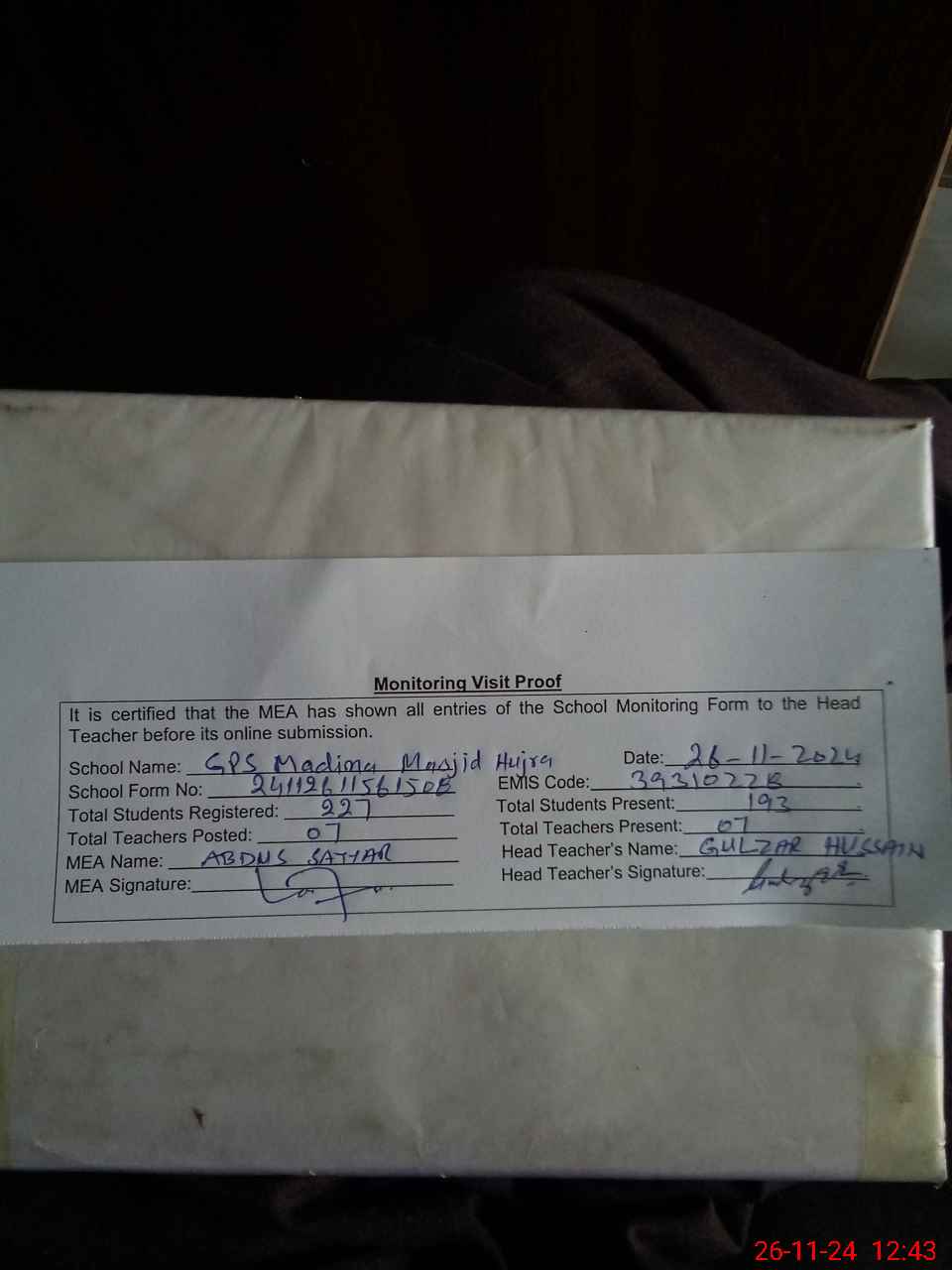 | Certified that this School was Inspected by the Undersigned MEA/DMO Today and the Information Stated Above is as Per Record. | |||||