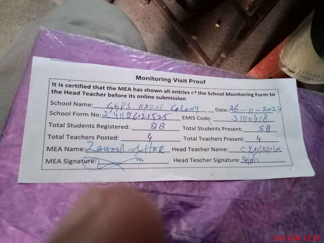 | Attendance Register | Head Teacher | MEA with School | Visit Proof |