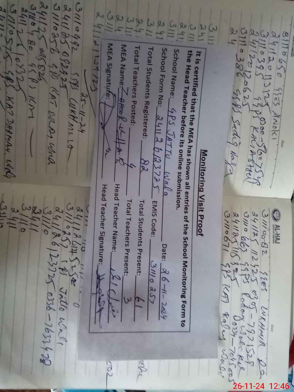 | EMIS Code: 31110257 | Name of School: GPS JATTU WALA | |||