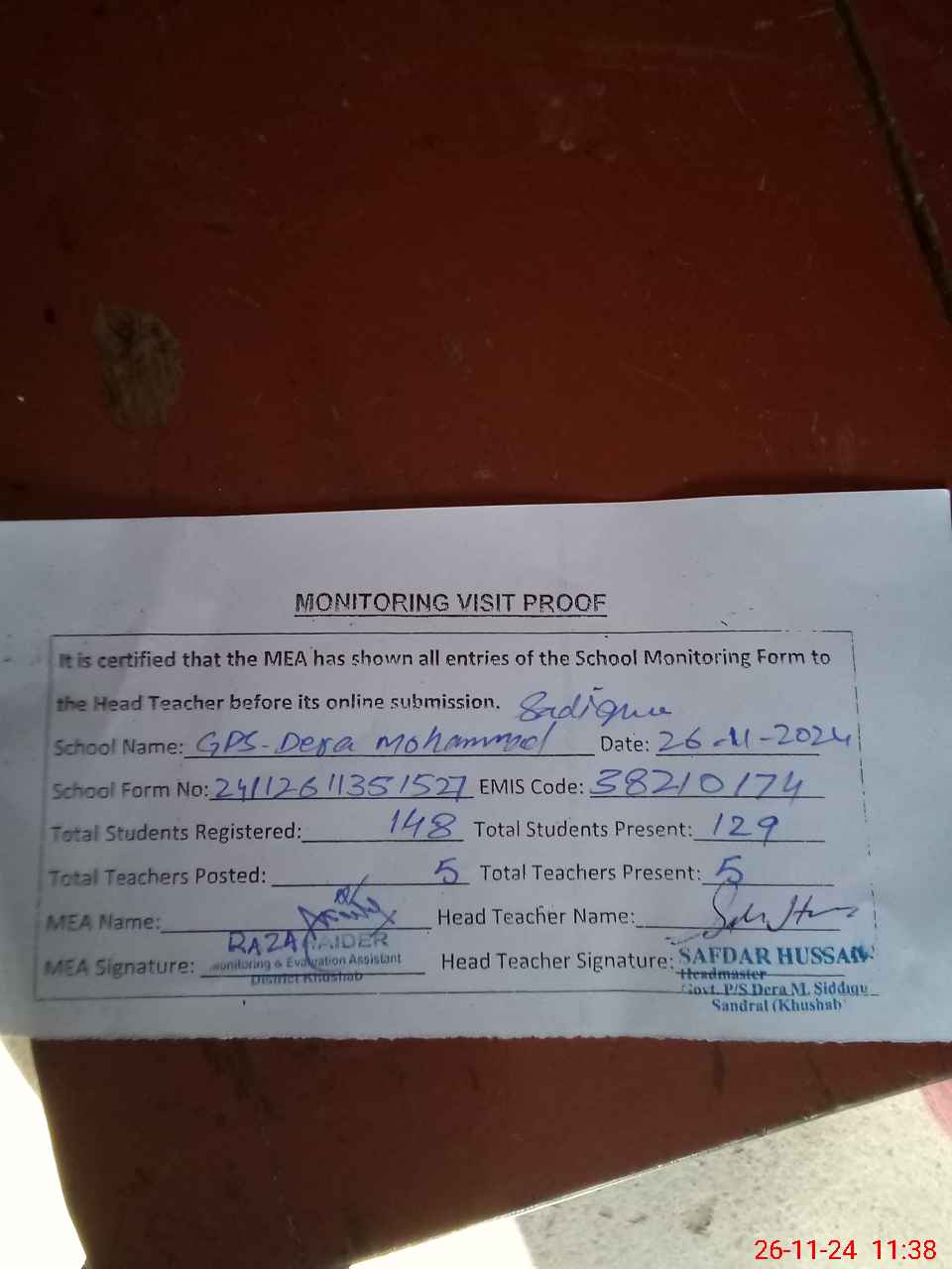 | Attendance Register | Head Teacher | MEA with School | Visit Proof |