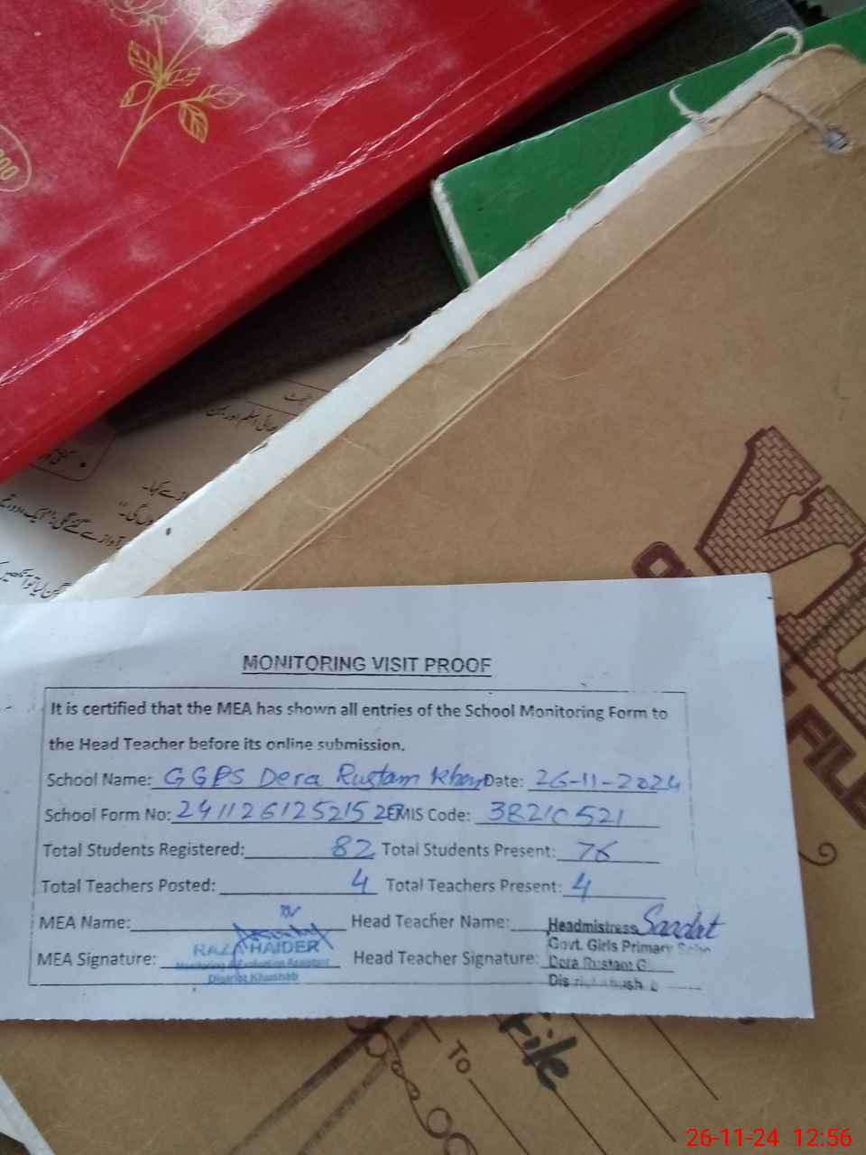| Attendance Register | Head Teacher | MEA with School | Visit Proof |