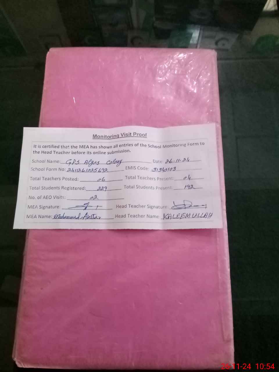 | Attendance Register | Head Teacher | MEA with School | Visit Proof |