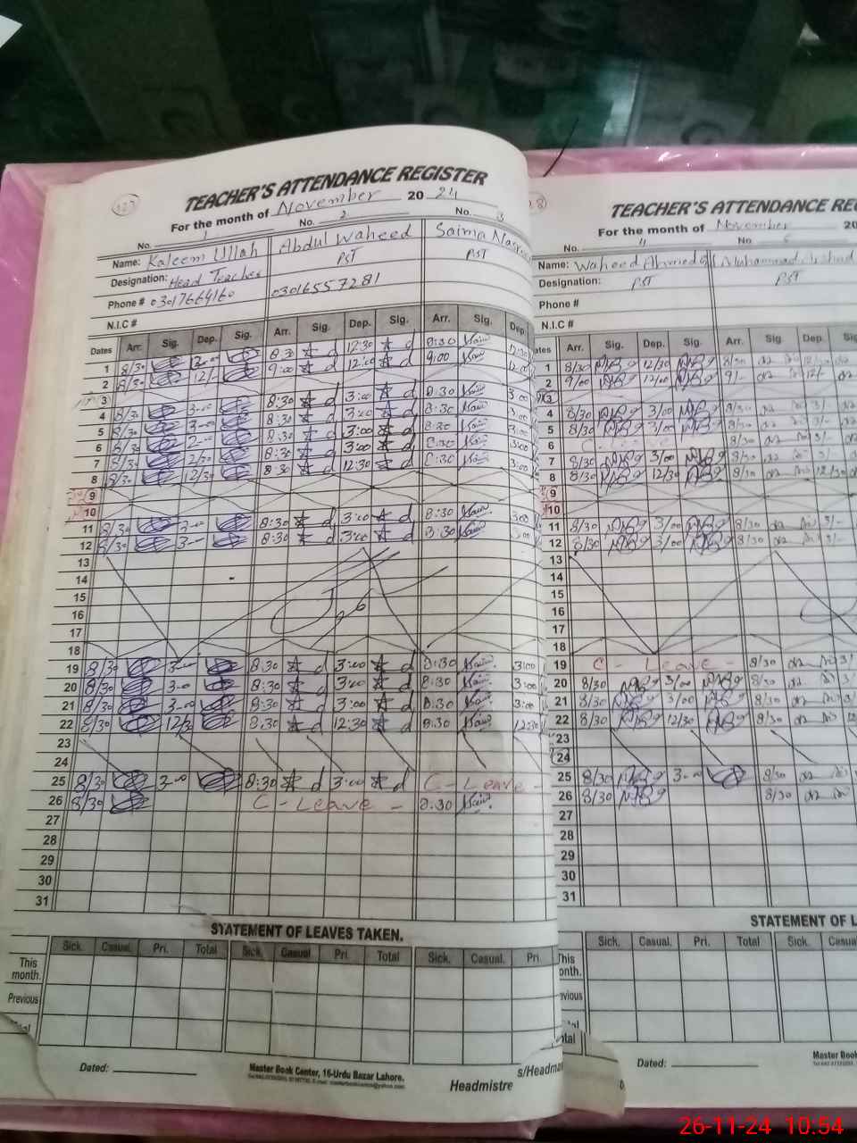 | CNIC | Full Name | Designation | R/C | Absence During Last Calender Month |