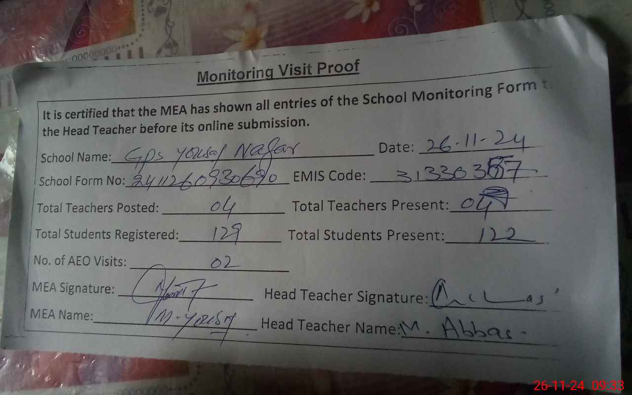 | EMIS Code: 31330357 | Name of School: GPS YOUSAF NAGAR | |||