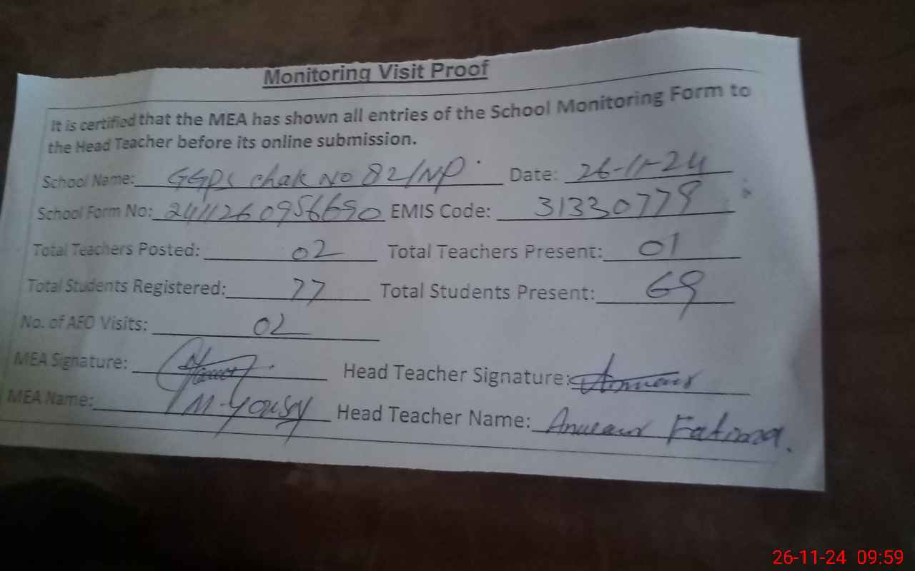 | EMIS Code: 31330779 | Name of School: GGPS CHAK NO. 82/NP | |||