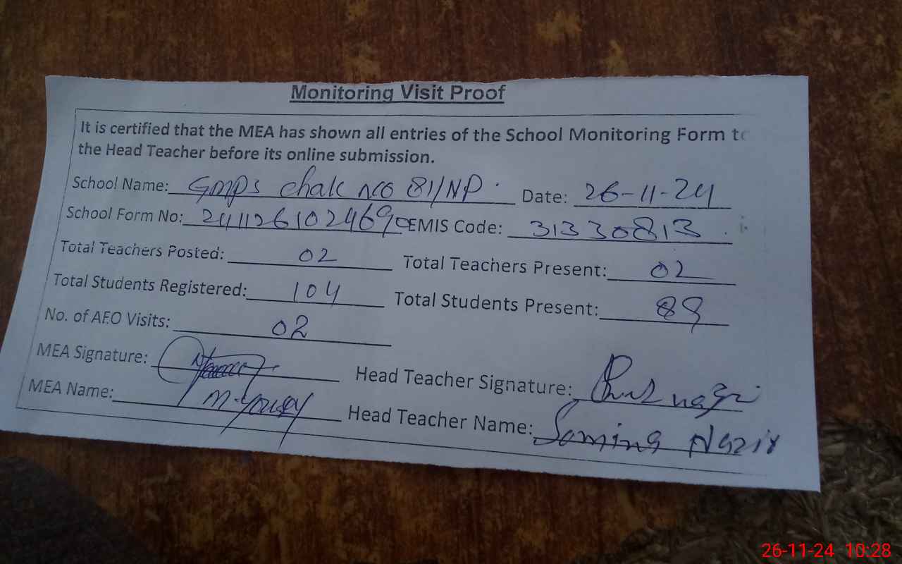 | EMIS Code: 31330813 | Name of School: GMPS CHAK NO. 81/NP | |||