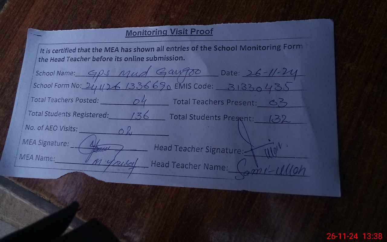 | Attendance Register | Head Teacher | MEA with School | Visit Proof |