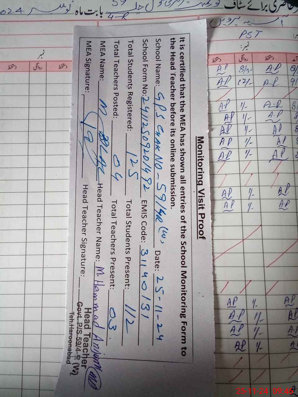 | EMIS Code: 31140131 | Name of School: GPS CHAK NO 59/4-R W | |||