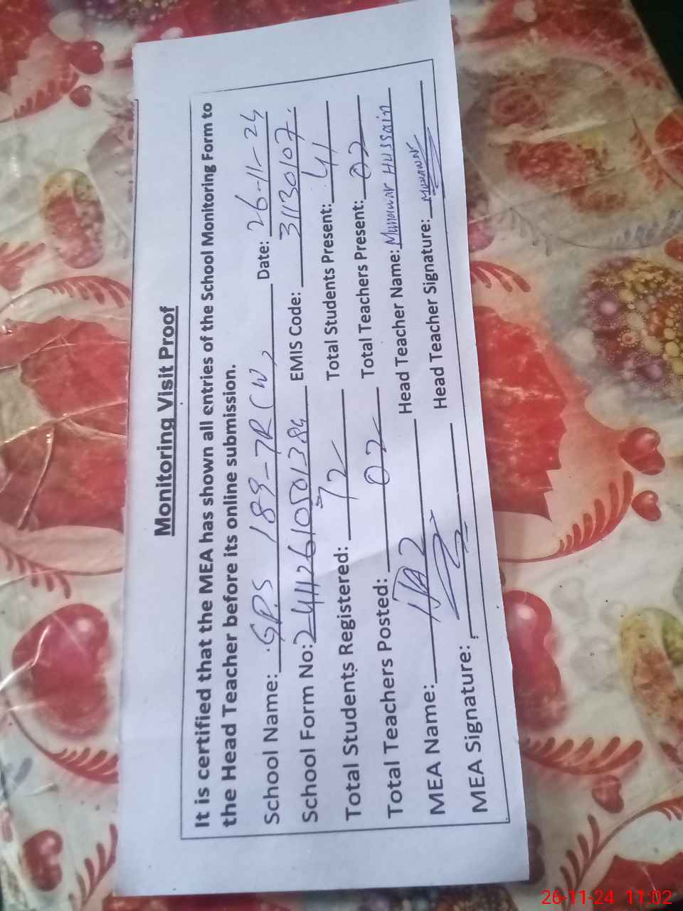 | Attendance Register | Head Teacher | MEA with School | Visit Proof |