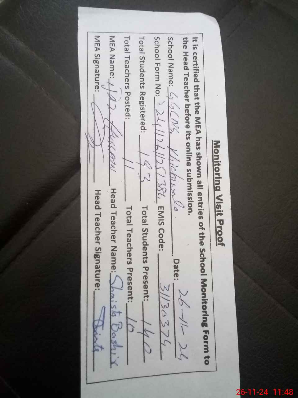 | Attendance Register | Head Teacher | MEA with School | Visit Proof |