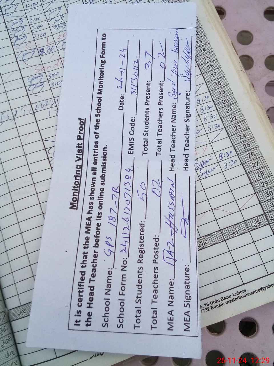 | Attendance Register | Head Teacher | MEA with School | Visit Proof |