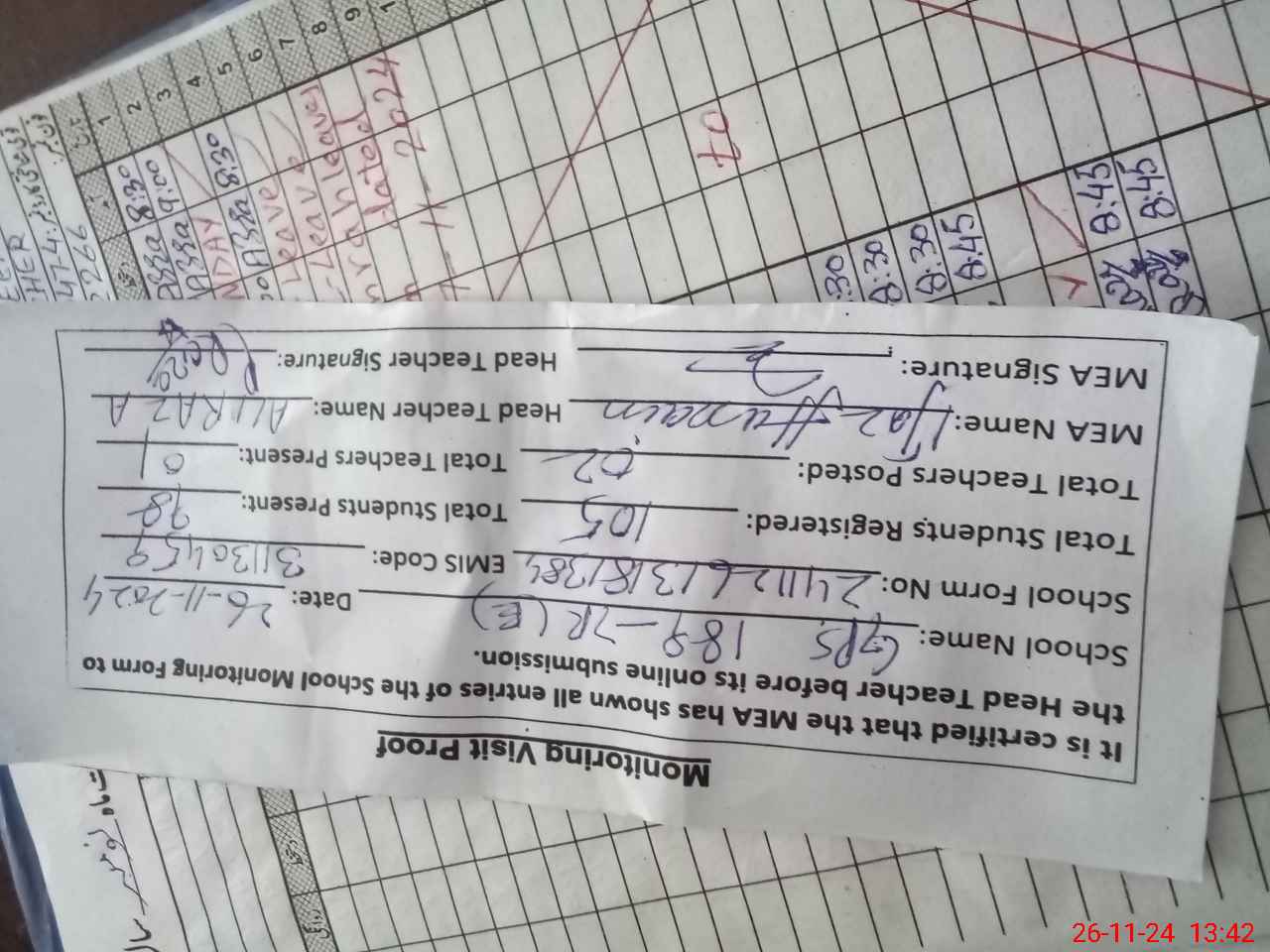 | Attendance Register | Head Teacher | MEA with School | Visit Proof |
