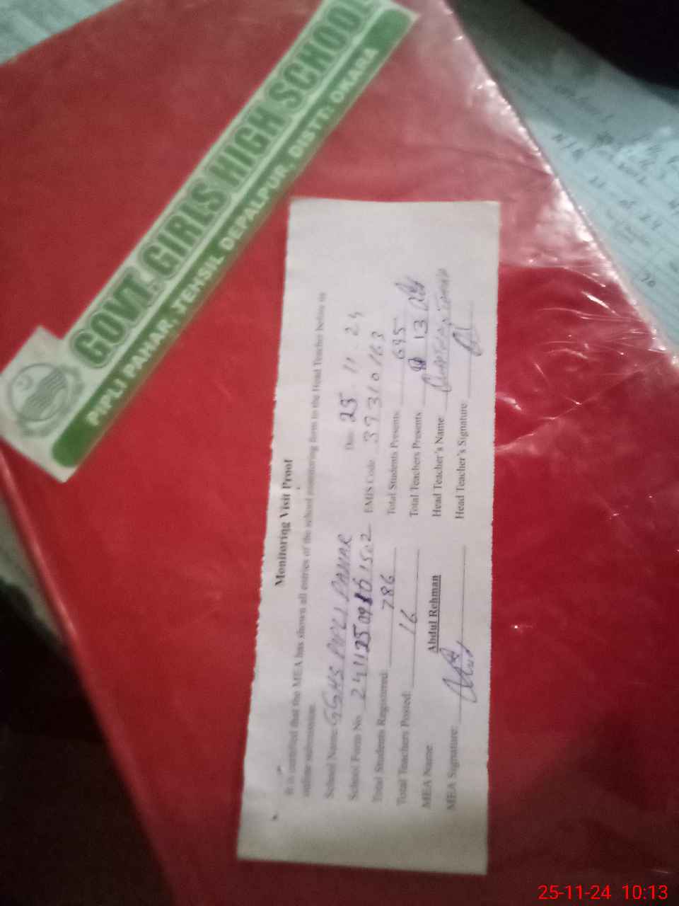| Attendance Register | Head Teacher | MEA with School | Visit Proof |