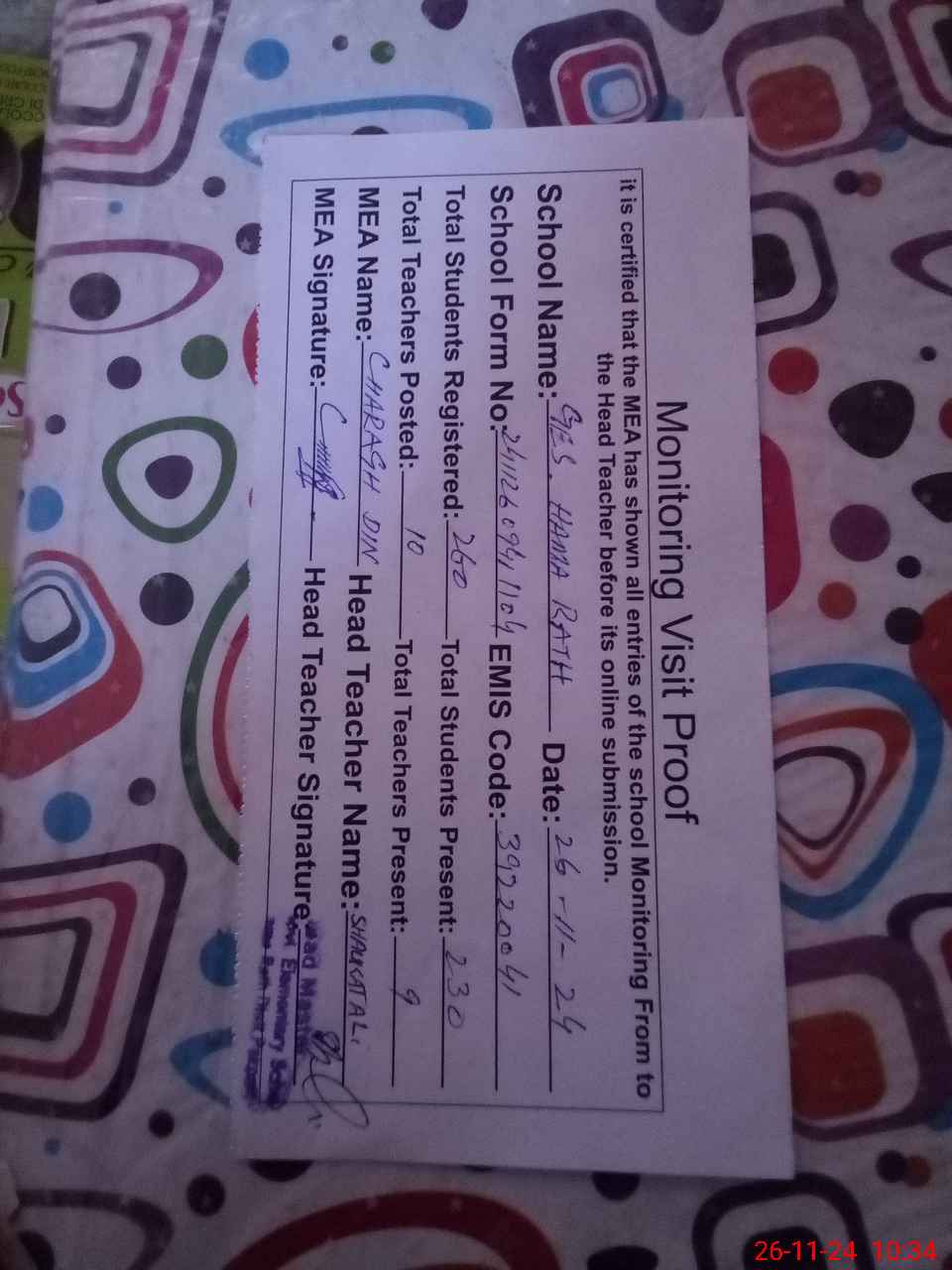 | Attendance Register | Head Teacher | MEA with School | Visit Proof |