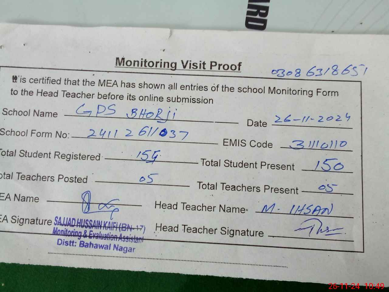 | Name: MU**** Ih**** Designation: (School Headmaster's/Headmistress's) PST Phone/Cell Number: 03**** |