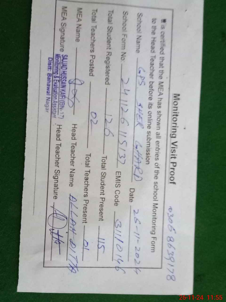 | Attendance Register | Head Teacher | MEA with School | Visit Proof |