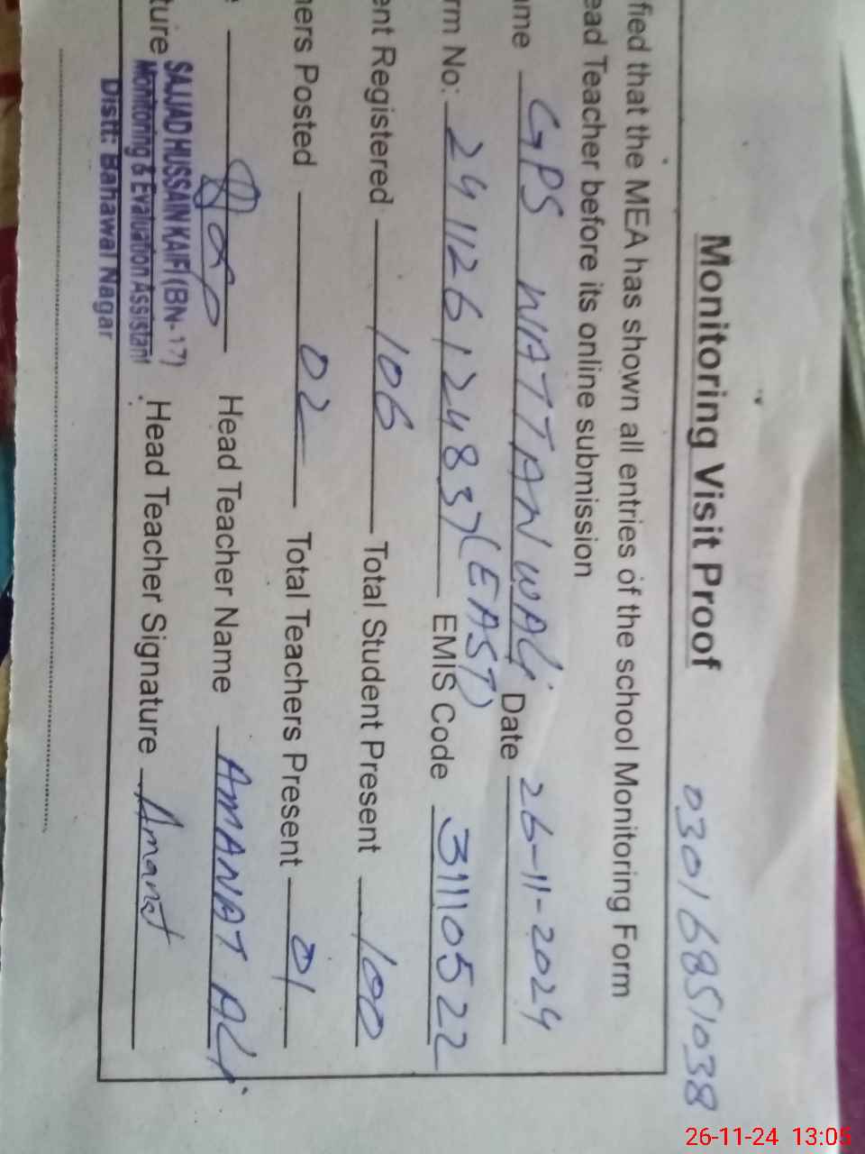 | EMIS Code: 31110522 | Name of School: GPS WATTWAN WALI EAST | |||