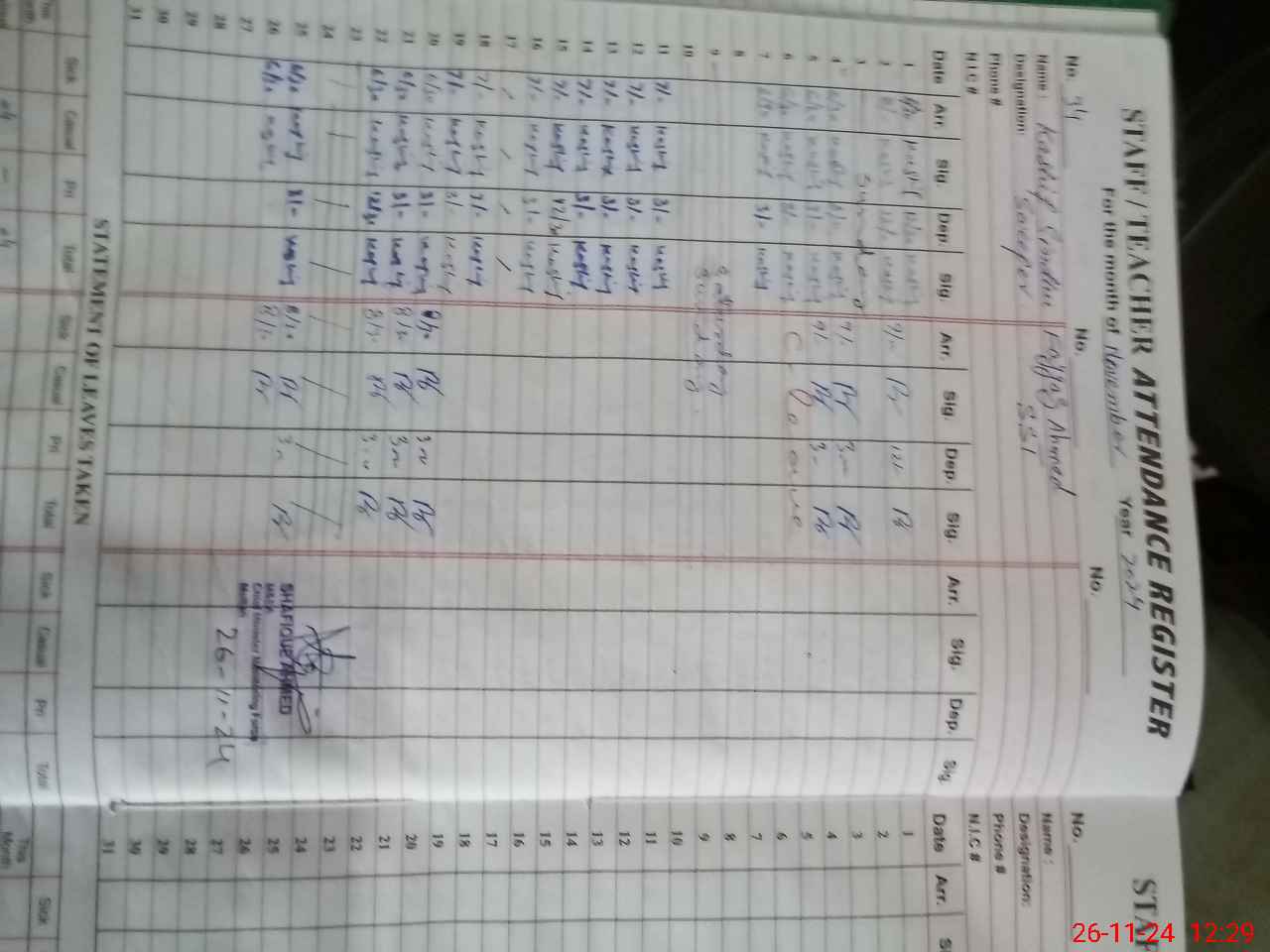| CNIC | Full Name | Designation | R/C | Absence During Last Calender Month |