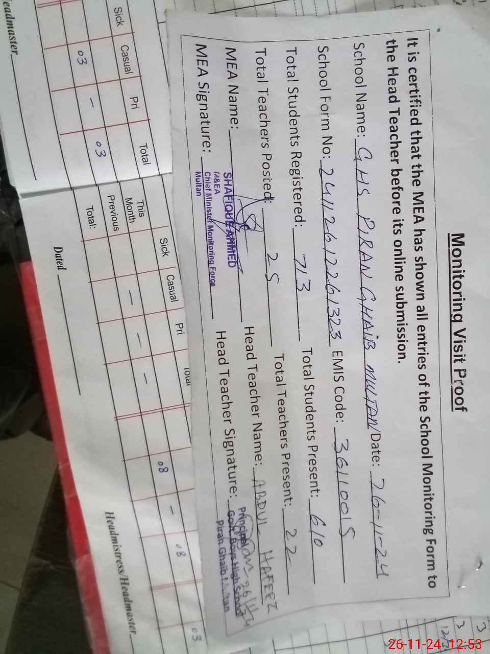 | Attendance Register | Head Teacher | MEA with School | Visit Proof |