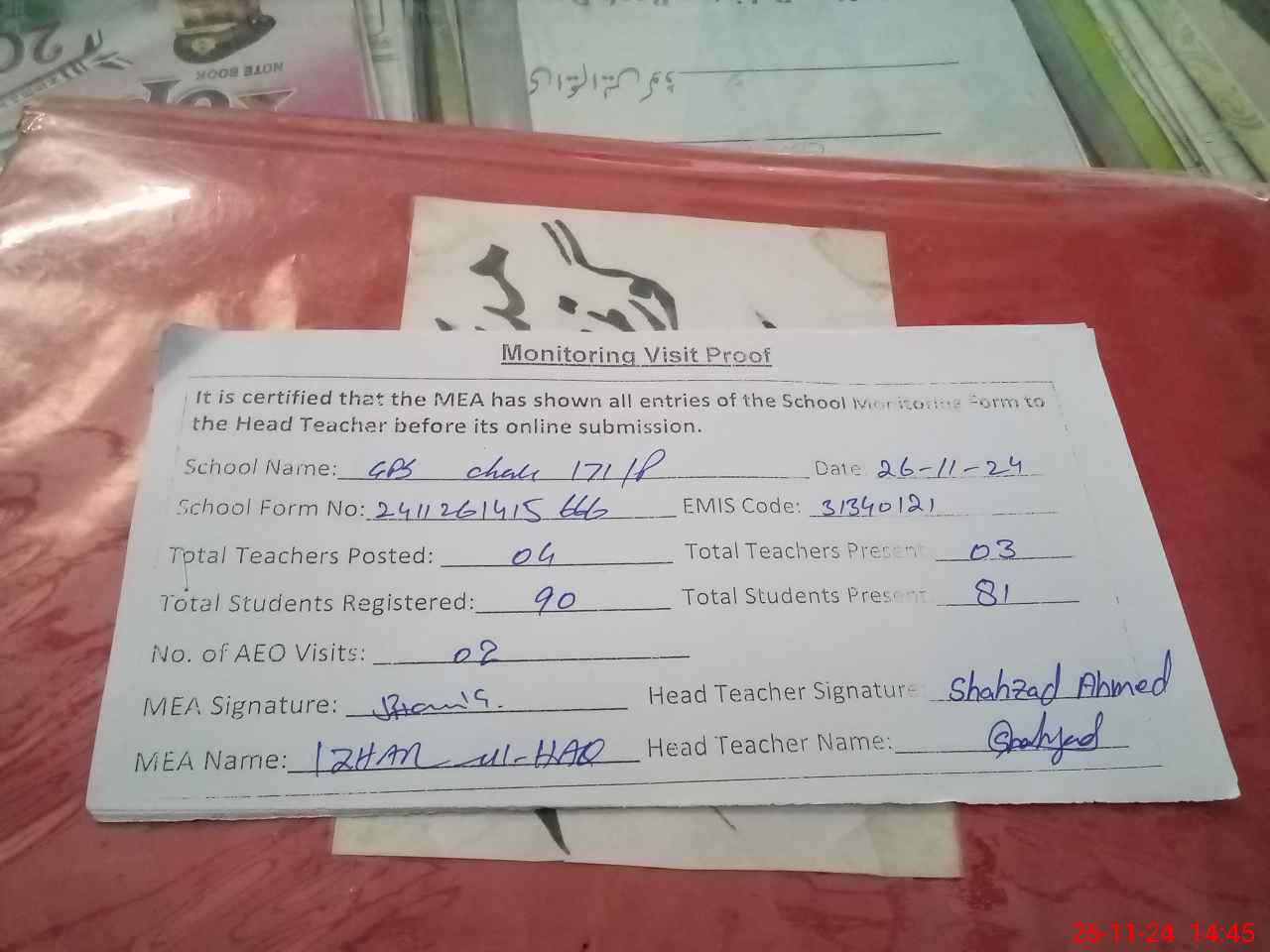 | Attendance Register | Head Teacher | MEA with School | Visit Proof |