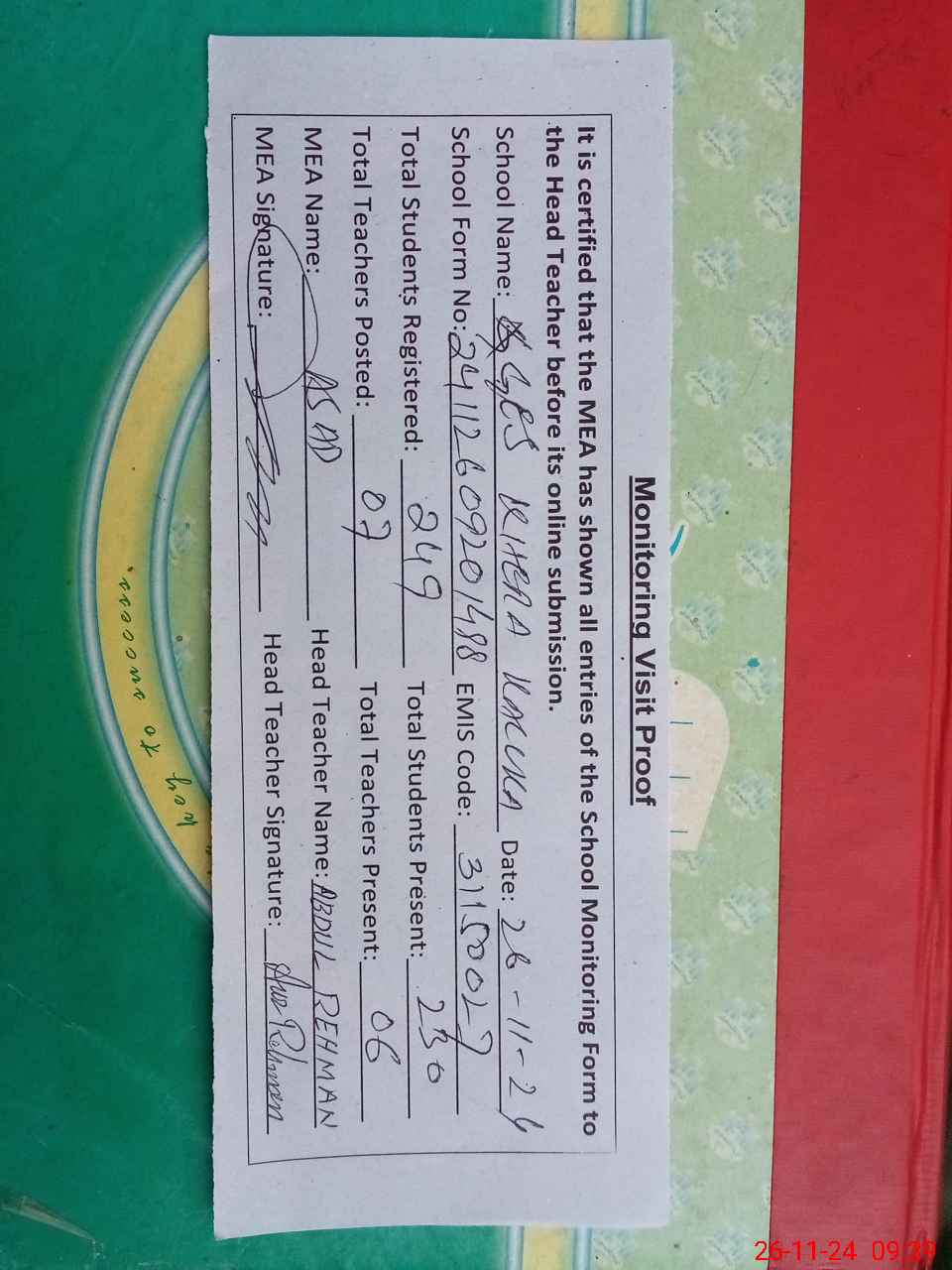 | Attendance Register | Head Teacher | MEA with School | Visit Proof |