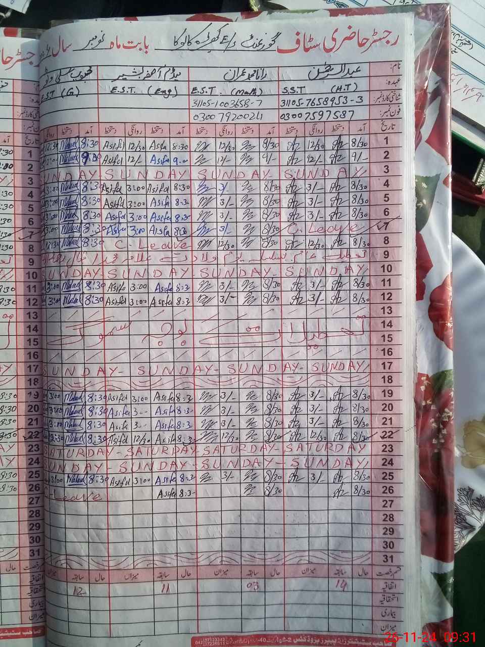 | CNIC | Full Name | Designation | R/C | Absence During Last Calender Month |