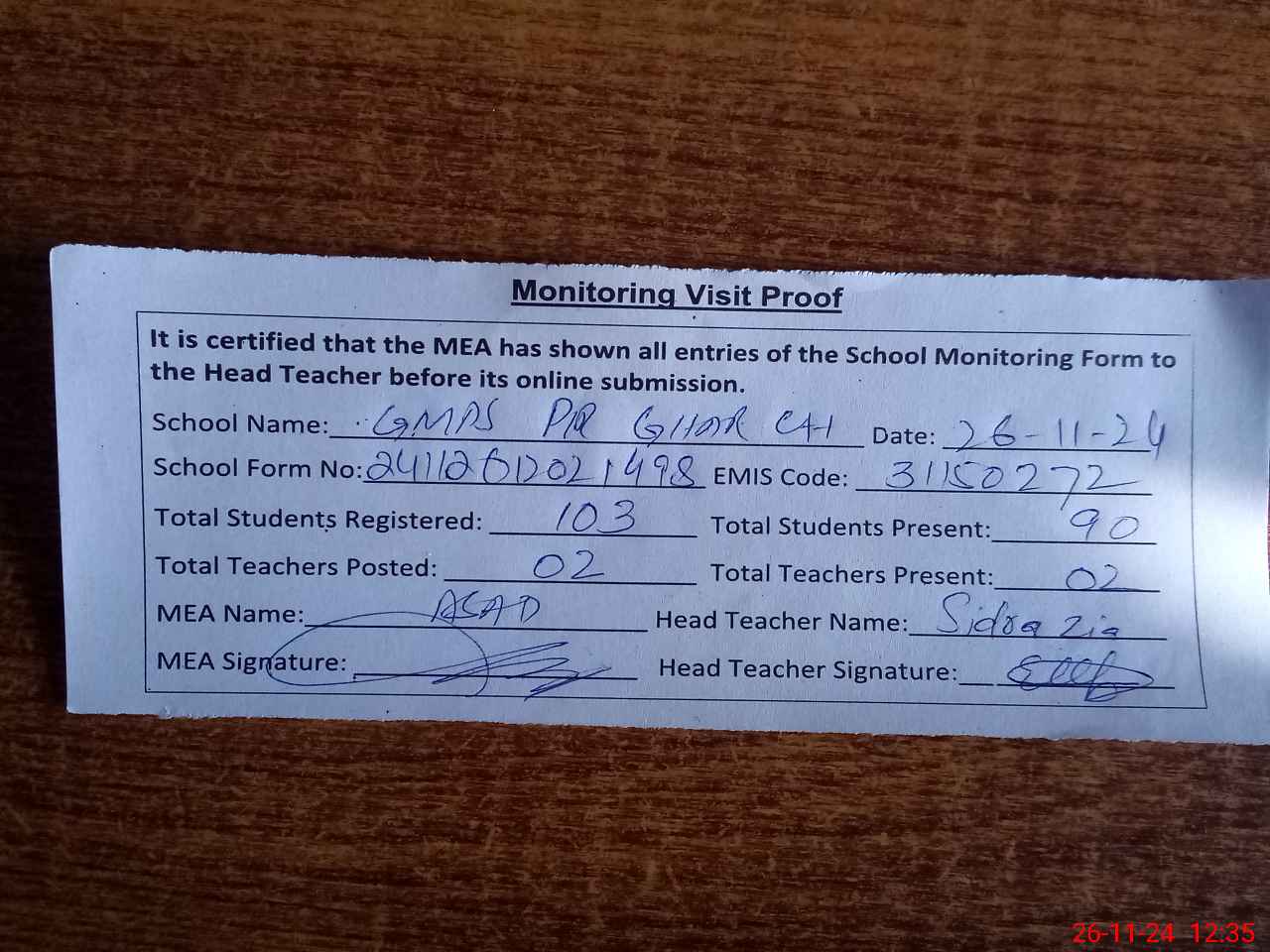 | Attendance Register | Head Teacher | MEA with School | Visit Proof |